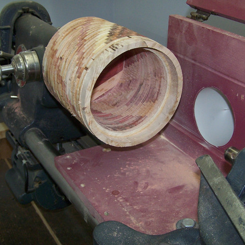 Even though, theoretically, you should have a perfectly even circle when gluing the rings together, there is considerable sanding needed to obtain a smooth bowl. So I mounted the bowl onto my lathe, so I could easily sand it with the bowl spinning. Before gluing the entire bowl together, I mounted the bottom half on the lathe, so that I could reach inside to sand it smooth. It would have been too hard to reach all the way in, with the entire depth of the bowl.